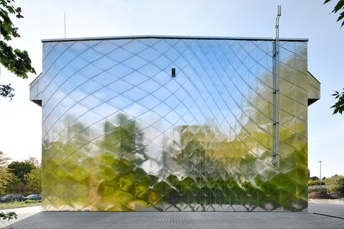 dreieck, schindel und energie – drei elemente für ein kunstwerk. die vorhangfassade besteht aus einem fassadenfinish aus zehn unterschiedlich dimensionierten schindeln in dreiecksform. die dreiecke aus eloxierten aluminium sind so angeordnet, dass sich die verläufe der schindeln als wirbel auf der fassade abbilden. die einzigartige gestaltung des fassadenkleids ziert das blockheizkraftwerk und die polierte mattspiegelnde schindeloberfläche lässt das gebäude in seine umgebung eintauchen. ​​ ​die feierliche preisverleihung des german design awards fand am 03. februar 2023 statt. das projektierte blockheizkraftwerk von thoma architekten gewinnt damit nicht nur den deutschen fassadenpreis 2022 für vorgehängte hinterlüftete fassaden (VHF), sondern auch den german design award - special 2023 in der kategorie building and elements für excellent product design. ​